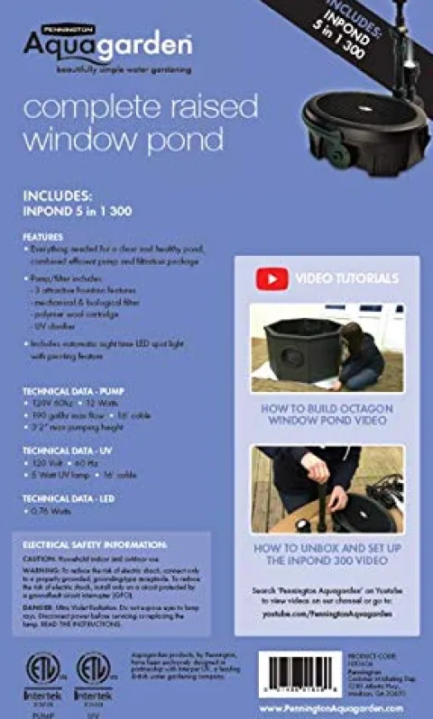 The Pennington Aquagarden Complete Raised Window Pond Kit transforms any garden, patio, or deck into a stunning oasis with its stylish octagonal design in an elegant mocha finish. This 106-gallon raised water feature includes the efficient Inpond 5-in-1 300 Pond & Water Pump, ensuring crystal-clear water and a healthy environment for fish and aquatic plants. Setting up the pond is hassle-free with a comprehensive guide, and maintenance is a breeze thanks to the integrated filtration system. Enjoy the beauty of moving water with three captivating fountain displays and a LED light that enhances the ambiance day and night. With two planting baskets for aquatic plants and convenient viewing windows, this kit provides a perfect habitat for fish while adding a serene touch to your outdoor space.