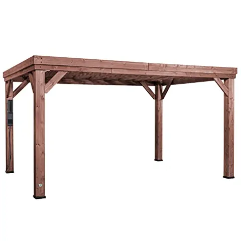 The Backyard Discovery Brockton 14′ x 10′ Modern Cedar Wood Pergola Kit combines style and functionality, making it an ideal addition to your outdoor space. Crafted from 100% cedar wood, it offers exceptional strength and natural decay resistance, while the rich dark walnut stain adds a contemporary touch. Designed for durability, this pergola withstands winds up to 100 mph, ensuring stability with its heavy-duty resin feet and concealed concrete anchors. The innovative PowerPort features three electrical outlets and three USB ports, perfect for powering your outdoor activities. With pre-cut, pre-drilled, and pre-stained components, along with easy-to-follow instructions via the interactive BILT app, installation is a breeze. Enhance your patio, deck, or garden with a structure that not only elevates your outdoor entertaining but also comes with a reassuring 5-year warranty.