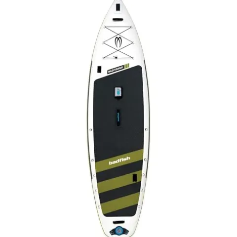 The Badfish Badfisher Inflatable Stand Up Paddle Board is the ultimate choice for fishing enthusiasts. This SUP by Badfish features a durable and unbreakable tri-fin design, measuring 11’ 6” x 36” x 6” and weighing only 33lbs, making it easy to transport and maneuver. The board is equipped with Scotty accessory compatibility and multi-point tie-down anchors, providing convenience and versatility for your fishing gear. Its white and green color scheme adds a touch of style to your fishing adventures, while the included paddle, backpack travel bag, pump, fixed fins, and coiled leash ensure you have everything you need for a successful day on the water.