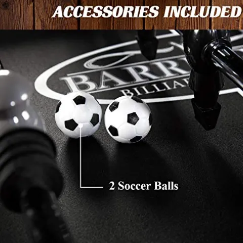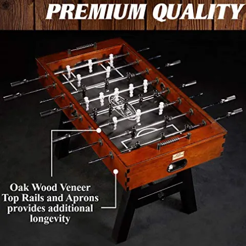- COMPETITIVE SIZE FOOSBALL TABLE: Prepare for fierce competition. This 56” gaming table has a spacious 46.75″x26.5″ playfield. Its sturdy construction and wooden-style paneling ensure it’s not just a game table but a decorative centerpiece in any game room.