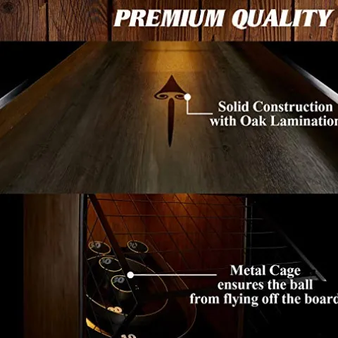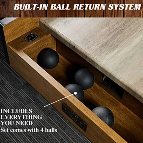 - CRAFTMANSHIP: The table construction is distressed Oak PVC laminate and engineered wood. After each roll, the automatic ball return sends the balls to the goal box for another throw. A metal cage with an antique finish keeps the balls in the game.