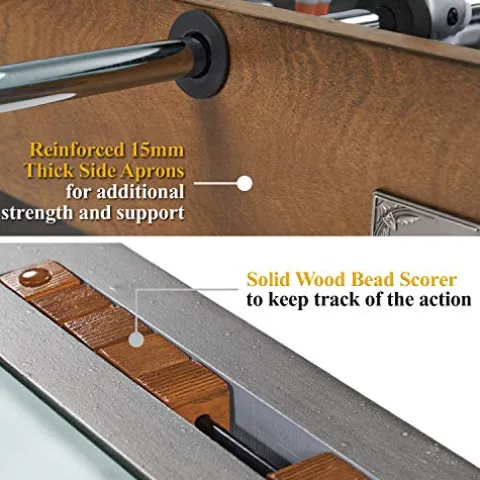 - CRAFTMANSHIP: The foosball table apron has a birchwood-style wood veneer-painted finish coated over an MDF base. A solid wood square bead scorer keeps track of your goals while playing.
