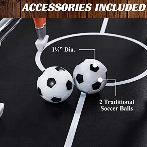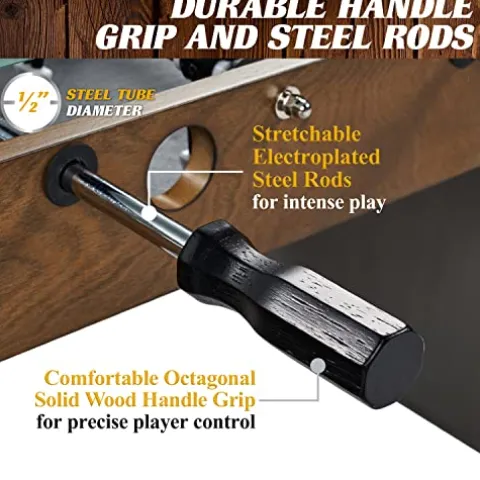- HIGH-SPEED ACTION: The 1/2” steel rods on this foosball table glide over plastic bearings and have a hollow design with octagonal solid wood handles for lightning-fast gameplay. Sideline ramps keep the ball in motion on the 9mm black MDF playfield.