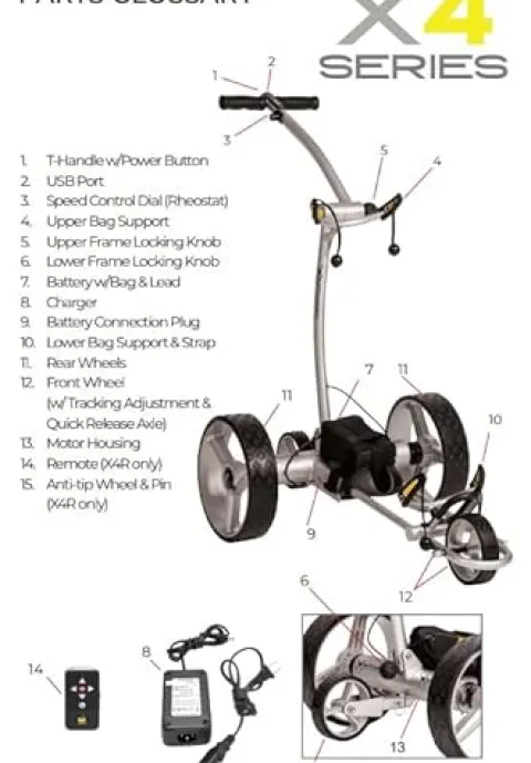 - π¨π‘ππππ§ππππ π©πππ¨π: The X4R electric golf push cart includes the oversized anti-tip wheel, and the ability to choose the battery that fits your needs making the X4R an unbeatable value