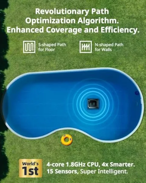 - Intelligent Path Optimization Algorithm: Powered by an industry-leading quad-core 1.8GHz CPU, 15 sensors, and AI algorithms, the robotic pool cleaner precisely maps your above and in-ground pool, optimizes the cleaning path, and combined with SonicSense obstacle avoidance, guarantees efficient navigation in complex pool environments