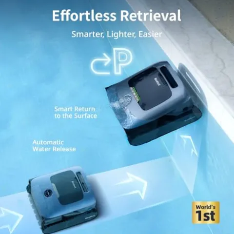 - Industry-exclusive Smart Return and Surface Parking: This pool vacuum redefines effortless pool maintenance with its intelligent return feature, surfacing automatically after cleaning or when the battery is low. It’s the first to automatically release water and park above the water surface, eliminating the need for heavy lifting and fishing