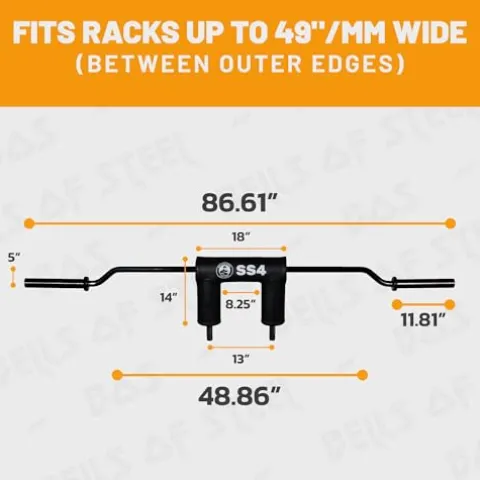 - 📦 What’s in the Package – Your new Bells of Steel Safety Squat Bar 4.0 with 1 pair of short handles. 32mm diameter; 86.6in length. Limited Lifetime warranty; 1-year warranty on pad. Note: It’s designed to fit perfectly in any Bells of Steel rack. However, it will NOT sit correctly if used in a non-Bells of Steel rack wider than 49in between the outer edge of the j-cups.