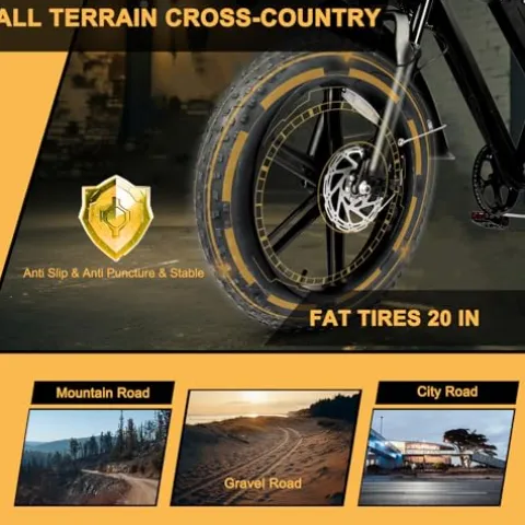 - 🚲 【 Conquering Diversified Terrain 】 Electric mountain bike configuration 20 inch Fat tires provide excellent puncture protection, making it easy to ride on concrete, gravel, grass, and soil. Due to the IP54 waterproof feature, mountain e bike for adults can travel through light rain and puddles without any worries. Combining front and rear suspension designs to alleviate vibrations and create a more comfortable and stable riding experience for you.