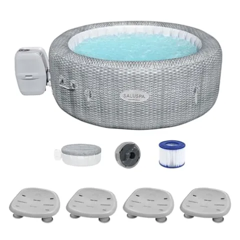 Transform your outdoor relaxation experience with the Bestway Coleman Honolulu AirJet Inflatable Hot Tub. Designed for 4 to 6 people, this elegant gray hot tub features 140 bubbling jets, delivering soothing massages at up to 104°F. The innovative EnergySense cover enhances energy efficiency by 40%, ensuring warmth while meeting strict environmental standards in select states. Crafted from DuraPlus 3-layer material, it offers superior durability against punctures and stretching, complemented by the Freeze Shield function to protect components in colder weather. The comprehensive package includes a powerful pump for easy inflation, heating, and filtration, along with essential accessories like a chemical floater and filter cartridges. Enhance your comfort with the included 4-pack of SaluSpa Underwater Non-Slip Spa Seats, featuring adjustable legs for customized seating height. Enjoy a convenient, luxurious spa experience in your own backyard.