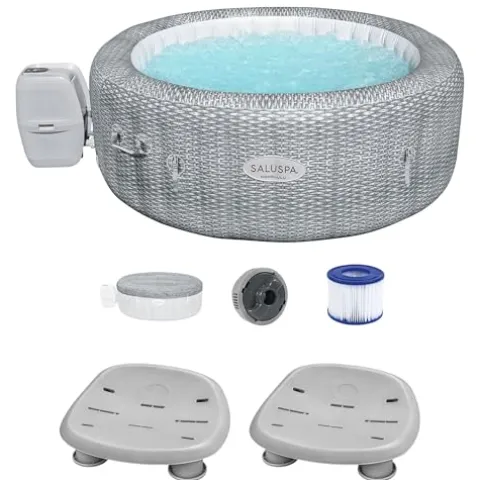 Enjoy the ultimate relaxation experience with the Bestway Coleman Honolulu AirJet Inflatable Hot Tub. This round hot tub features 140 bubbling warm jets, perfect for up to 4 to 6 people, reaching temperatures up to 104 degrees Fahrenheit. The EnergySense cover ensures 40% more energy efficiency, keeping your hot tub warm throughout the season. Constructed with DuraPlus 3-layer material, this hot tub is exceptionally durable and includes Freeze Shield automatic heating to prevent freezing in colder temperatures. The package also comes with a pump for easy setup, a cover, spa pump, chemical floater, 2 filter cartridges, repair patch, and a 6-foot cord. Additionally, the 2-pack of SaluSpa Underwater Non-Slip Spa Seats with adjustable legs allows you to customize your seating height for the perfect spa experience.