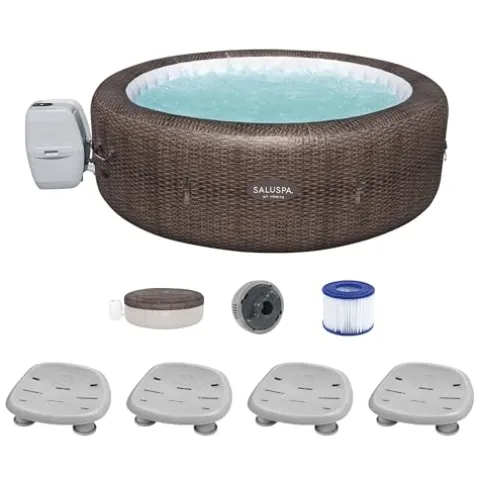Transform your relaxation experience with the Bestway Coleman St Moritz AirJet Inflatable Hot Tub, designed for comfort and efficiency. Perfect for up to 7 people, this spa features 180 invigorating air jets that provide a soothing massage in water heated to a luxurious 104°F. The included EnergySense cover enhances energy efficiency by 40%, keeping your spa warm and saving on energy costs. Its robust DuraPlus 3-layer construction ensures durability, offering significant resistance to punctures and stretching, with a Freeze Shield automatic heating feature to protect components in cold weather. The user-friendly pump facilitates quick inflation, heating, and controls the massage system, while the spa set includes a cover, chemical floater, filter cartridges, and repair patch for comprehensive care. Complete your spa setup with a pack of four SaluSpa non-slip seats, featuring adjustable legs for optimal comfort. Elevate your home relaxation with this versatile and durable hot tub setup.