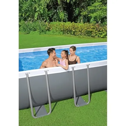 Enjoy endless summer fun with the Bestway Power Steel 18′ x 9′ x 48″ Rectangular Metal Frame Above Ground Outdoor Swimming Pool Set. This pool set includes a durable steel frame with a Seal and Lock System for strength and stability. The TriTech enhanced 3-ply PVC liner with a mosaic print interior adds an attractive touch while providing durability. With a 1,500 GPH sand filter pump, ChemConnect dispenser, ladder, and secure pool cover included, this pool set is perfect for all ages to enjoy. Easy assembly and disassembly make it convenient for off-season storage. Please check your HOA rules before purchasing as not all housing agencies permit above-ground pools.
