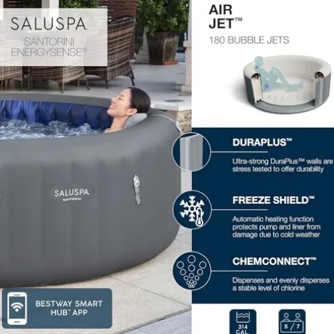 Experience the ultimate relaxation in the Bestway SaluSpa Santorini HydroJet Pro Inflatable Hot Tub. This portable outdoor spa accommodates up to 5 to 7 people, offering a luxurious massage experience with 180 bubbling warm jets that can reach temperatures up to 104 degrees Fahrenheit. Enjoy energy-efficient operation with up to 40 percent more efficiency, keeping your hot tub warm while meeting strict energy efficiency requirements. The durable DuraPlus 3-layer material provides superior resistance to punctures and stretching, while the Freeze Shield heating system ensures components won’t freeze during winter. Complete with a cover, spa pump, chemical floater, filter cartridges, repair patch, and a 6-foot cord, this hot tub offers a water capacity of 314 gallons and maximum heat for a truly indulgent spa experience.