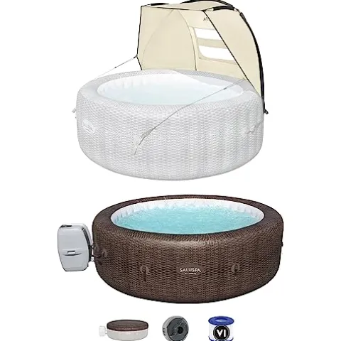 - Bundle set includes a SaluSpa canopy for added protection from the sun that attaches to the 85 by 28-inch St. Mortiz SaluSpa inflatable 7-person hot tub with a soothing massage system, rapid heating, and integrated water filtration