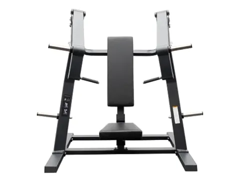 Enhance your workout routine with the Stacked Series- Plate Loaded Incline Chest Press by BK BodyKore. This equipment features heavy-duty foam grips and commercial-rated precision pivot bearings for a comfortable and effective workout session. The nickel-plated weight plate storage bars offer convenient storage, while the adjustable padded seat and ergonomic backseat design ensure a customized fit. Constructed with 11-gauge steel and electrostatic powder coat finish, this incline chest press is a durable and reliable choice for commercial or home gym use. Elevate your chest workout with this high-quality and versatile piece of equipment.