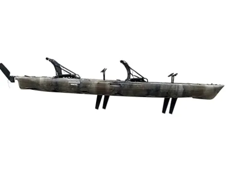 The Brooklyn 13.5 Tandem Pedal Kayak in camo by BKC is your ultimate partner for adventurous water excursions and fishing trips. Built to accommodate two adults plus gear with a 680-pound weight capacity, this kayak boasts a robust roto-molded high-density polyethylene construction for lasting durability. Its 13.5-foot length offers a perfect blend of speed and stability, powered by dual pedal drive systems for effortless gliding. Fishing enthusiasts will appreciate the three built-in rod holders and a stable hull for stand-up casting. With ample storage featuring watertight hatches and cargo recesses, along with comfortable adjustable seats and easy-to-use rudder control, this kayak ensures both convenience and performance. Enjoy peace of mind with a 5-year hull warranty, making it ideal for both leisurely paddles and ambitious fishing adventures.