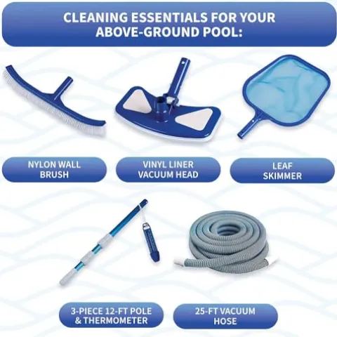 - A COMPLETE BACKYARD OASIS – Crafted for straightforward DIY installation, this pool package includes all the essentials for setup and maintenance, including a standard-gauge overlap liner, skimmer, filter system, a-frame ladder, and maintenance kit.