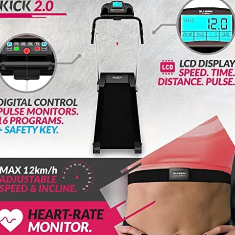 Enhance your home workout routine with the Bluefin Fitness KICK 2.0 Innovative High-Speed Folding Treadmill. This treadmill from Bluefin Fitness is designed with cutting-edge features to elevate your fitness experience. Compatible with the Kinomap fitness app, you can access a wide range of training videos, coaching classes, and structured workouts. The treadmill offers joint protection with its shock absorption system, providing a smooth and low-impact running surface. With a quiet and energy-efficient motor, speeds up to 12 Km/h, and an 18% manual incline, this treadmill is perfect for professional training. The digital screen displays essential workout metrics, while the integrated hand sensors and wireless heart rate strap compatibility allow for heart rate monitoring. Complete with Bluetooth speakers and a safety key, the Bluefin Fitness KICK 2.0 Treadmill is the ultimate home workout companion.