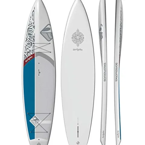 The Boardworks Navigator Touring All Water Stand Up Paddleboard in White/Grey/Blue offers a blend of comfort and performance for avid paddleboarders. Crafted with Bombshell Epoxy Hardboard, this 11′ 6″ board is designed for superior glide and excellent tracking on various water surfaces. It features a Lifts UP Handle for convenient portage, forward and aft storage for gear, and an ultra-comfortable Honey Fob Deck Pad. Whether cruising calm lakes or exploring coastal waters, this paddleboard ensures a smooth and enjoyable experience. Perfect for paddleboarding enthusiasts looking for quality and style, the Boardworks Navigator is a top choice for all water adventures.