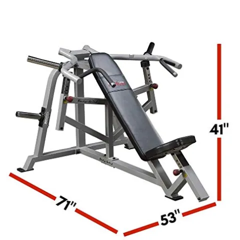 Enhance your upper body building routine with the Body-Solid Leverage Incline Press. This sleek black incline press features a unique converging press arm movement with advanced biomechanics, promoting effective muscle engagement. Its independent, unilateral arm action ensures balanced muscle development, while the adjustable press arms cater to users of all sizes. Compact at 71 by 53 by 41 inches, and weighing 167 pounds, this machine is perfect for home gyms. Plus, it comes with a limited lifetime manufacturer’s warranty, offering peace of mind as you sculpt and strengthen your physique.