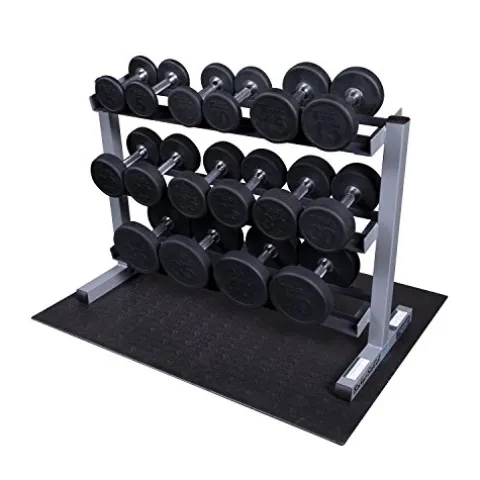 The Body-Solid Round Rubber Dumbbell 5-40 lb. Pairs Package with Rack offers a comprehensive set of 8 pairs of dumbbells ranging from 5 to 40 lbs., totaling 360 lbs. in weight. These round rubber dumbbells are designed with chrome-plated solid steel handles for durability and a comfortable grip. The package includes the Body Solid Dumbbell Rack GDR363 for convenient storage and organization, along with a floor mat for added protection. Ideal for strength training and muscle building, this package is a versatile and essential addition to any home or commercial gym setup.