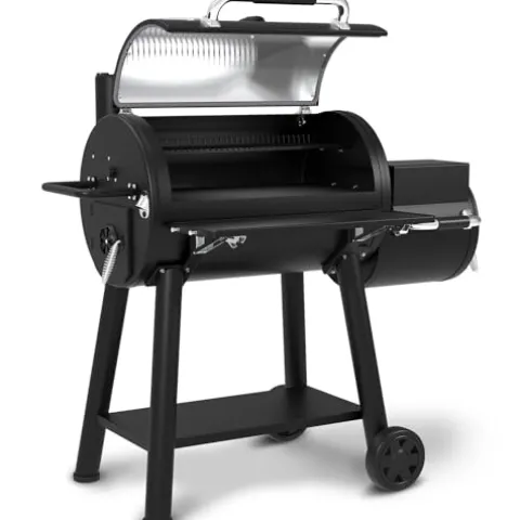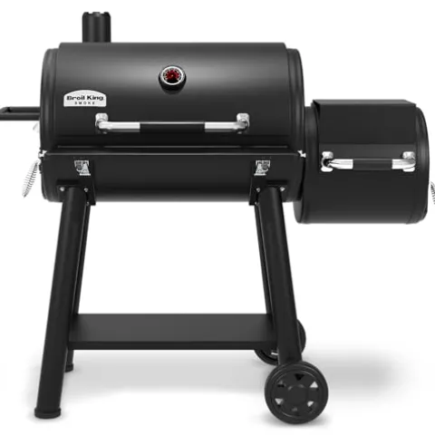 The Broil King 958050 Offset Smoker in sleek black combines durability with exceptional performance for the ultimate outdoor cooking experience. Crafted from robust 2mm steel, it offers a generous 625 sq. in. primary cooking surface, perfect for smoking large cuts of meat or multiple dishes at once. Heavy-duty cast iron cooking grids ensure even heat retention and superior flavor, while the advanced air vent system features a chimney-style stack with Roto-Draft damper technology for precise temperature control. With dual-purpose smoke diffusing charcoal trays and a removable ash tray in both cooking chambers, this smoker makes maintenance effortless, allowing you to focus on creating delicious, smoky flavors. Ideal for both beginners and seasoned pitmasters, the Broil King 958050 elevates your outdoor cooking game.