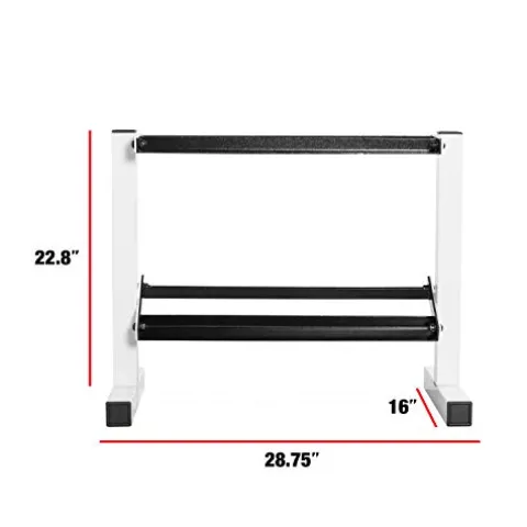 - Two Tier rack features – made from industrial grade steel & coated in a baked matted powder coat to withstand heavy loads & resist damage from extensive use; compact storage with flat Top rack & precision angled lower rack for easy access to dumbbells