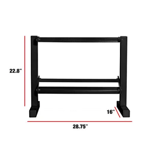 - Two Tier rack features – made from industrial grade steel & coated in a baked matted powder coat to withstand heavy loads & resist damage from extensive use; compact storage with flat Top rack & precision angled lower rack for easy access to dumbbells