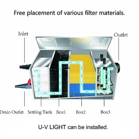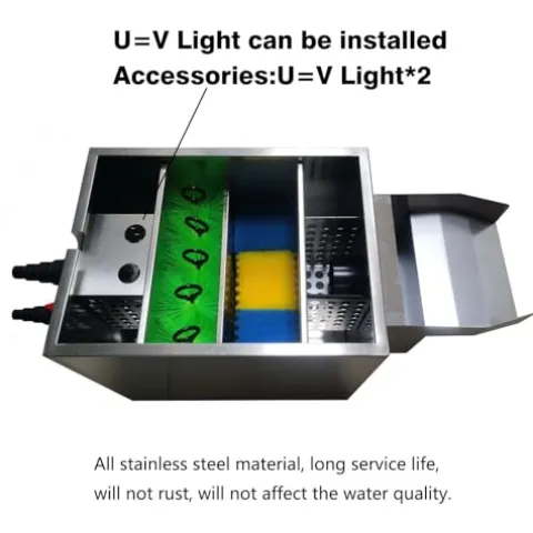 - ❤All stainless steel box, long service life. Normal use will not be damaged.Not afraid of sun and rain.Suitable for decorative ponds 1000~3000 Gallons.The specific volume of use is determined by the cleanliness of the fish pond water.