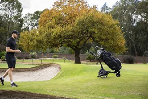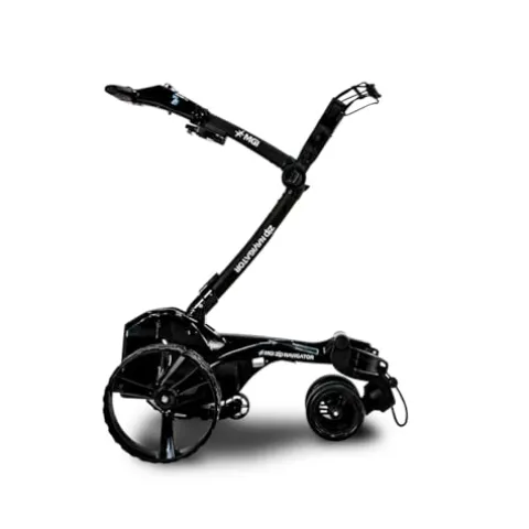 - ALL TERAIN ZIP FOLD TECHNOLOGY: Innovative & compact one piece frame will make setup easy and quick to and from the course. New Zip Fold System is 12% lighter and 25% smaller for easy transport and space saving. The rear wheels can be inverted on the axle to reduce the footprint when not in use. Folded Dimensions (Inverted Rear Wheels); 27.55 x 18.5 x 16.5 Inches. Weight (With Battery): 34.96 LBS. All-Terrain tread rear wheels handle all conditions