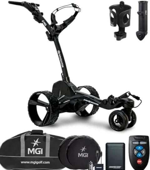 - BUNDLE INCLUDES: MGI ZIP NAVIGATOR Electric Golf Cart, Drink Holder, Umbrella Holder, Travel Bag, Rear-Wheel Covers, and Signature Series Power Bundle