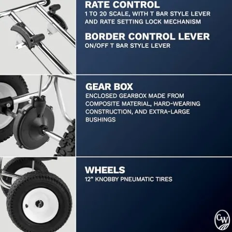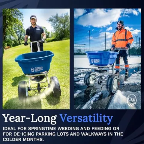 The Charles Walters CW3000S Professional Broadcast Spreader is engineered for efficiency and durability, making it the ideal choice for maintaining your lawn and walkways. Built on a robust stainless steel frame, this spreader supports up to 80lbs of fertilizer or ice melt, with a generous spread width of 20 feet that ensures even distribution. Its two wide, knobby pneumatic tires provide exceptional maneuverability, while the automated border control system allows for precise application from a distance. Featuring an adjustable rate control with a range from 1 to 20, you can customize the spread to suit your specific needs. Please note that this model does not include a Winter Material Plate and is not compatible with coarse rock salt. Elevate your landscaping and winter maintenance tasks with the reliable performance of the CW3000S.