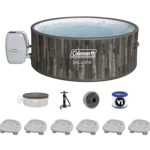 Transform your backyard into a personal oasis with the Coleman SaluSpa Sicily AirJet Hot Tub. Designed for 2 to 7 people, this spa features a SaluSpa Massage system and a powerful AirJet system with 180 jets to envelop you in soothing warmth. Enjoy peace of mind with the Freeze Shield automatic heating function, which protects components in colder temperatures. Adjust the water temperature up to 104°F with the easy-to-use digital control panel. Built from durable DuraPlus materials, the hot tub includes a reinforced cover to retain heat and keep debris out. The ChemConnect dispenser ensures a clean and healthy spa experience by evenly distributing chlorine. Enhance your relaxation with a set of six non-slip, adjustable Bestway spa seats, allowing you to find the perfect seating height. Effortlessly transport the spa with built-in handles when needed. Indulge in luxury and comfort with this comprehensive spa package.