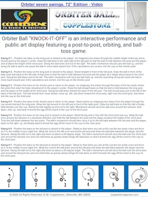 - OrbiterBall by COPPLESTONE is a posts and ball toss game, action skill game, and a Funtional Art-in-Motion sculpture. 6′ Orbiter Ball Toss Demonstration – YouTube – http://www.youtube.com/watch?v=JXIxKKFCkEo