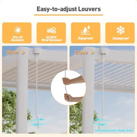- Structural stabilization: Crafted with high-quality aluminum frame and coated with durable paint, our louvered pergola is lightweight, resistant to deformation, and durable against various elements