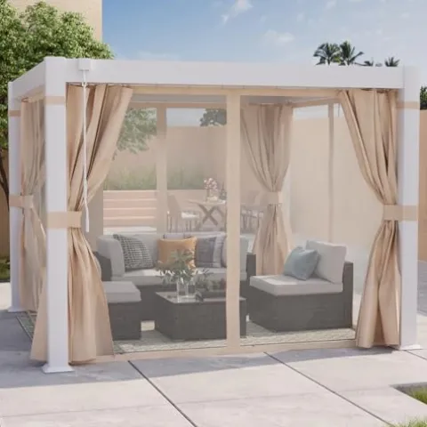 The COSIEST 10’×10′ Louvered Pergola combines style and functionality, making it the perfect addition to your patio, garden, or backyard. This elegant white aluminum structure features an adjustable roof with up to 90 degrees of louvered angles, allowing you to easily control sunlight and weather exposure. The integrated hidden drainage system efficiently channels rainwater away, keeping your outdoor space dry. With detachable curtains and nets, you can enjoy added privacy and protection from insects, while the durable aluminum frame ensures long-lasting stability against the elements. Assembly is straightforward, and options for enhanced stability make this pergola a reliable choice for your outdoor gatherings. Elevate your outdoor experience with the COSIEST Louvered Pergola.