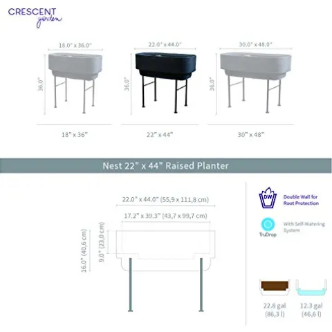 The Crescent Garden Nest Indoor/Outdoor Raised Garden-Bed Planter Box in Olive is designed for effortless gardening, featuring a self-watering TruDrop One system that can sustain plants for up to six weeks without additional watering. With an easy assembly process that requires no tools, this versatile planter is perfect for cultivating fruits, vegetables, flowers, or herbs. Its innovative design includes a pre-drilled drainage hole to promote healthy growth, while the double-wall construction protects roots from extreme temperatures. Made from 100% recyclable high-grade polyethylene, this lightweight and eco-friendly planter is durable and weather-resistant, backed by a 10-year limited warranty. Ideal for urban gardening, it transforms any small outdoor space into a lush green haven.