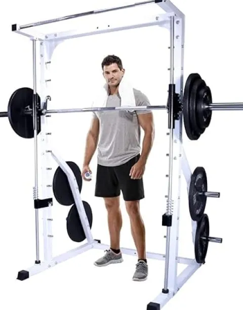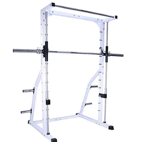The Deltech Fitness DF4900 Smith Machine offers a comprehensive strength training solution for your home gym. Featuring precision linear roller bearings on solid steel bars, a 58 lb. Olympic bar with a 700 lb. capacity, and convenient rear supports for plate storage, this machine is designed for durability and performance. The chrome plated bar hook rods and weight holders add a touch of style to its functionality. Please note that weights are not included, and assembly requires two people. With its versatile design and quality construction, this machine is ideal for those looking to elevate their workout routine.
