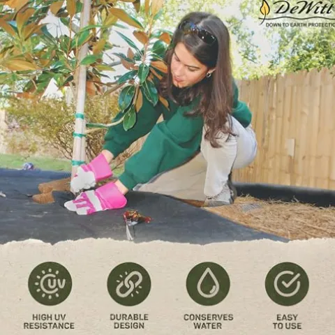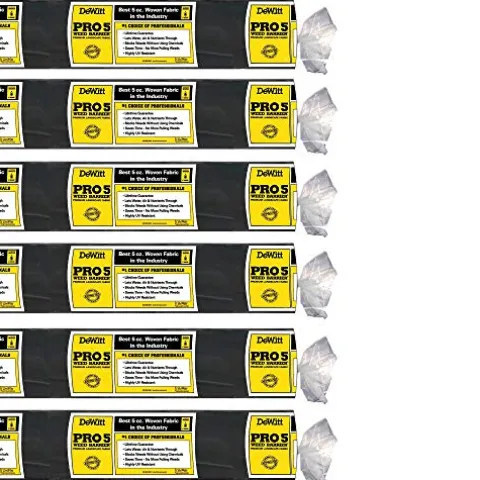 The Dewitt P5 Pro 5 Ounce Weed Barrier Ground Cover Fabric is an essential solution for both commercial and home landscaping, delivering exceptional performance with its sturdy, woven polypropylene design. Each package contains six rolls, providing a generous coverage area of 1,250 square feet. This advanced fabric conserves soil moisture, enhances plant growth, and effectively prevents weed germination, achieving a remarkable 90 to 95 percent seed germination rate. Its hydrophilic treatment allows for optimal air, water, and nutrient flow, while the striped pattern every 12 inches simplifies plant alignment. With superior resistance to punctures and tears, the black fabric blocks light to further suppress weed growth. Endorsed by leading landscape architects and government agencies, this product comes with a limited lifetime warranty, ensuring lasting quality and reliability for all your gardening needs.