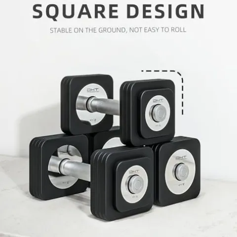 - SAFETY, ANTI-ROLLING AND ANTI-SLIP: The dumbbell pieces have a square shape design that prevents rolling. The outer TPU coating is environmentally friendly and odorless, and does not damage floors. The alloy handle is non-slip and rust-proof, fits your palm and provides a comfortable grip, and the knurled texture on the handles ensures a firm grip and prevents slipping.