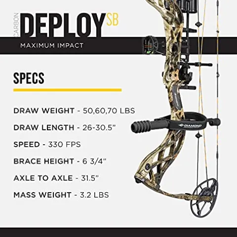 The Diamond Archery Deploy SB Compound Bow in Breakup Country is designed for serious hunters and archery enthusiasts alike, offering an exceptional blend of performance and versatility. With a draw weight of 70 lbs and capable of launching arrows at speeds up to 330 feet per second, this bow ensures swift and accurate shots every time. It features a lightweight design at just 3.2 lbs, crafted from a durable aerospace-inspired carbon riser that enhances maneuverability in the field. Equipped with the R.A.K. system, it comes with essential hunting accessories, making it an all-in-one solution for your archery needs. Whether you’re targeting game or honing your skills, this bow is the perfect companion for every adventure.