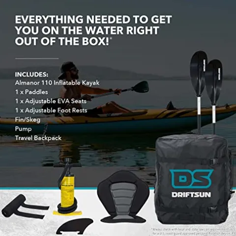 The Driftsun Almanor 110 Inflatable Kayak in vibrant yellow is your go-to choice for solo recreational touring. Boasting a sleek hull design crafted from rugged 600d polyester for durability and UV protection, this kayak is ideal for long-distance paddling on flat waters and mild ocean conditions. Equipped with an EVA padded seat offering high back support, a dual-blade paddle, deluxe pump, and convenient travel bag, this package ensures comfort and convenience on the water. With a weight capacity of 300 lbs and easy 9-minute inflation time, the Almanor 110 is your ticket to adventure and relaxation on the water.