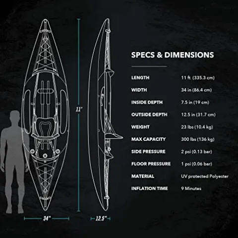 - Kayak Specifications – Exterior: 11’(L) x 34”(W) / Weight: 23 Lbs. / Capacity: 300 Lbs. 1 Adult, Gear, or a Furry Friend / Inflation Time: 9 Mins. / Inflation Pressure: 2 PSI Side Tubes & 1 PSI Floor