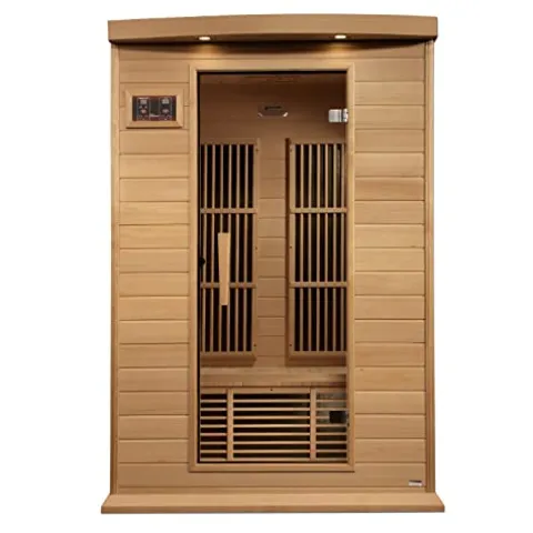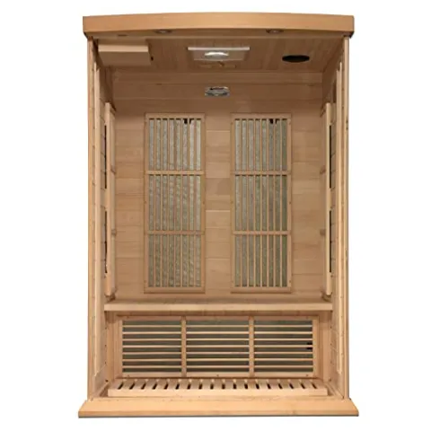 Elevate your wellness experience with the DYNAMIC SAUNAS Maxxus MX-K206-01 Elite 2-Person Near Zero EMF FAR Infrared Sauna. Crafted from natural reforested Canadian Hemlock, this sauna boasts a sleek natural wood finish and comfortably accommodates two people. Engineered for safety, it features six PureTech Near Zero EMF carbon heating panels, ensuring minimal EMF exposure while delivering soothing heat up to 140F. Enjoy a personalized ambiance with the chromotherapy color lighting system, alongside exterior accent lighting for an enhanced atmosphere. Stay entertained with the built-in FM radio, Bluetooth, and MP3 auxiliary connection. Delivered curbside on a pallet for your convenience, this sauna combines luxury, safety, and modern technology for an unparalleled relaxation experience.