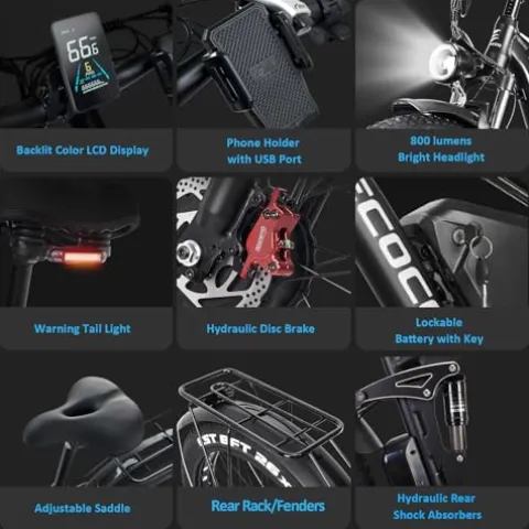 - 🚴♀️【𝗨𝗽𝗴𝗿𝗮𝗱𝗲𝗱 𝗙𝘂𝗹𝗹 𝗦𝘂𝘀𝗽𝗲𝗻𝘀𝗶𝗼𝗻 Ebikes】Based on feedback from buyers and EBycco’s multiple tests, EB7 The Pro gets upgraded front shock absorbers and softer rear shock absorbers for 2024. More responsive adjustable hydraulic front fork absorbers and the hydraulic rear shock absorbers, reduce the pressure on the joints and body during riding to the maximum extent and will provide you with a very comfortable riding experience even on rough roads.