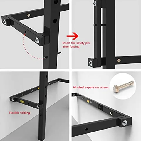 Maximize your home gym space with the EAS1SOOPE Foldable Power Rack Wall Mounted Squat Rack. This sturdy rack is constructed with 14 gauge steel and features smooth welds, providing a reliable 800lb weight capacity for your bench press and squat workouts. The space-saving wall-mounted design allows for easy folding up and down, perfect for small spaces or garage gyms. With 8 all-steel expansion screws included for wall mounting, this rack offers both flexibility and stability, making it a versatile addition to any home gym setup.
