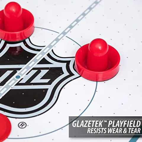 - This premium table hockey game includes power corner inserts that add extra bounce and excitement to the action! Scratch-resistant GlazeTek air hockey table surface and cabinet coating shines and protects from wear and tear