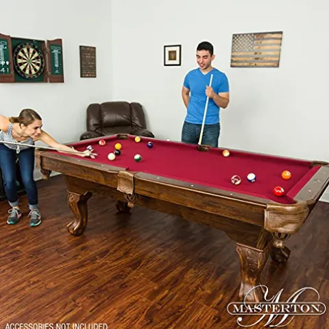 The Burgundy Masterton by EastPoint Sports is a premium billiards table designed for those looking to elevate their game room experience. With improved packaging to ensure safe delivery, this traditional billiards table measures 87” x 50” x 31” and is perfect for larger rooms. Featuring K-66 rubber bumpers for professional playability, a scratch-resistant top rail for durability, built-in leg levelers for stability, and classic parlor style drop pockets for a sleek look, this table is ideal for honing your skills in 8 Ball Pool, 9 Ball Pool, One-Pocket, or classic billiards. Upgrade your game room with the Burgundy Masterton and become the pool shark you’ve always wanted to be.