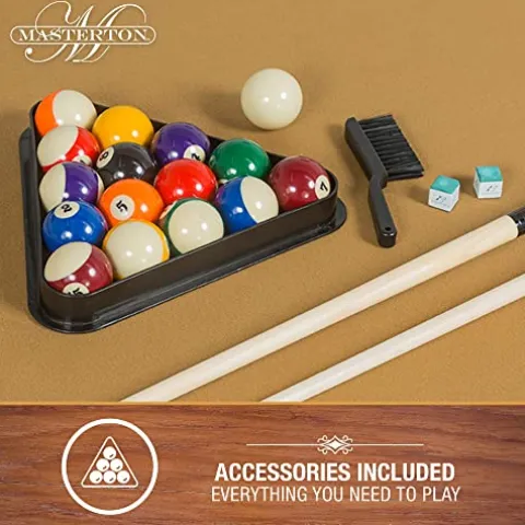 Enhance your game room with the EastPoint Sports Masterton 87-Inch Pool Table in Tan. Perfect for casual games or intense matches, this billiards table offers a traditional gaming experience with a modern touch. Measuring 87” x 50” x 31”, it fits well in larger rooms, making it ideal for man caves, game rooms, or basements. With premium rubber bumpers providing consistent playability, built-in leg levelers for balance, scratch-resistant top rail for durability, and parlor style drop pockets for a classic look, this pool table is designed for endless hours of entertainment. Get ready to showcase your skills and strategy in 8 Ball Pool, 9 Ball Pool, One-Pocket, or classic billiards on this top-quality game table.