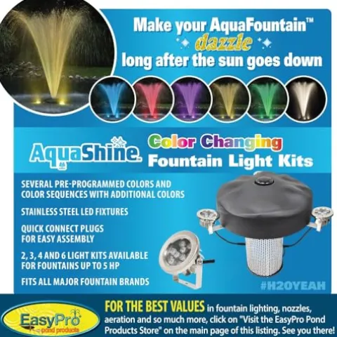 The EasyPro AF100 AquaFountain combines elegance and efficiency, creating a stunning water display that mimics larger fountains without the hefty price tag. Designed for a minimum operating depth of 30 inches, this fountain features a robust 1 hp motor that operates continuously while ensuring safety with built-in thermal and overcurrent protection. Its high-density foam floats are encased in a decorative cover, complemented by screens that keep debris from clogging the pump. The durable 100-foot power cord, along with a timer and GFI panel, makes setup and operation seamless, allowing you to enjoy a captivating water feature in your pond with minimal effort.